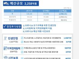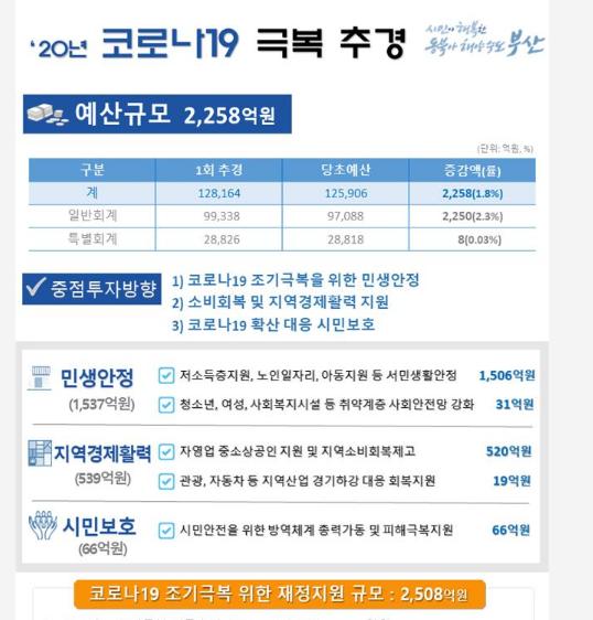 이번 추경을 포함하여 코로나19 극복을 위한 재정지원 규모는 총 2,508억 원이다. 공공부문 소상공인 임대료감면(73억), 재난.재해 기금 및 중소육성기금 재원(68억), 긴급집행(33억), 기부금품(26억), 예비비(50억) 등으로 재난대응 가용재원을 총동원하여 이번 사태를 극복하고 조속히 시민들의 생활 안정을 도모하고자 한다.