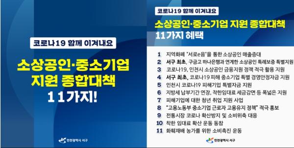 인천서구(구청장 이재현)는 사력을 다해 코로나19의 확산 방지에 나서는 한편, 코로나19의 장기화로 인해 소비심리가 위축되어 어려움을 겪는 소상공인과 중소기업인을 돕고자 꼼꼼하고 치밀하게 구에서 지원 가능한 최대한의 방안을 준비하여 종합지원대책을 마련하였다.