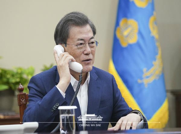 문재인 대통령은 에마뉘엘 마크롱 프랑스 대통령의 요청으로 13일 오후 6시45분부터 7시20분까지 35분간 전화 통화를 했다. 양 정상은 최근 전세계적으로 확산되고 있는 코로나19 사태의 심각성에 인식을 같이하고, 이를 극복하기 위한 양국 간 공조 방안에 대해 의견을 교환했다.