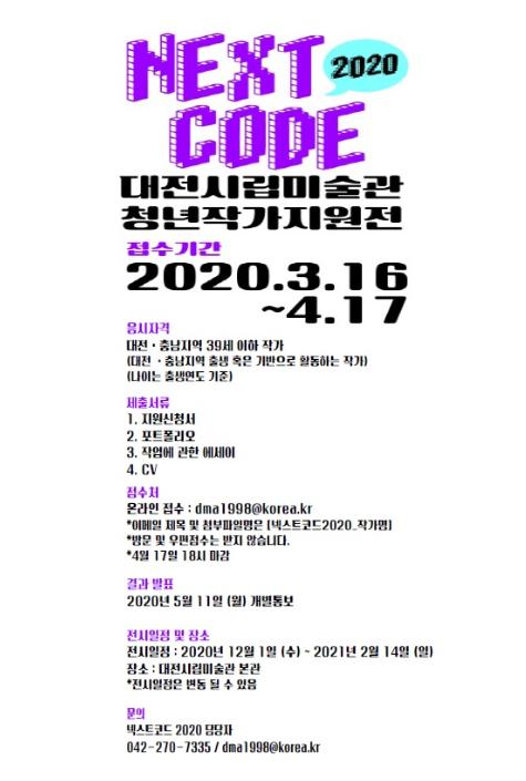 대전시립미술관이 3월 16일부터 4월 17일까지 한 달간 청년작가지원전‘넥스트코드 2020’작가 선정 공모를 진행한다.