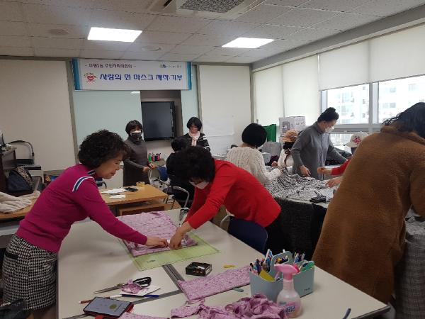 부평구(구청장 차준택)부평1동 주민자치위원회가 코로나19 확산 방지를 위해 지역의 어려운 이웃들에게 기부할 ‘사랑의 면 마스크’를 제작하고 있다.
