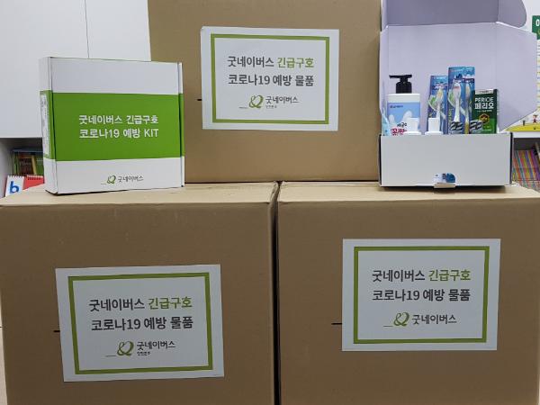 이에 앞서 NGO 굿네이버스 인천본부(본부장 정근진)는 손소독제, 세정제, 소독용물티슈 등이 들어있는 ‘코로나19’ 위생물품 키트 56박스를 어려운 아이들을 위해 써달라며 연수구 드림스타트에 전달했다.