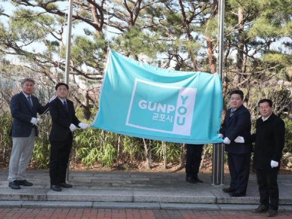 시는 16일 시청 현관에서 시장, 군포시의회 시의장?부의장, 실?국장단만이 참여한 가운데 통합 도시브랜드 현판식과 시기 게양식을 개최하며 상징물 조례 개정 공포에 따른 새로운 군포 브랜드의 전면 시행을 알렸다. 최근의 코로나-19 확산 상황을 고려해 간소하게 진행한 것이다.