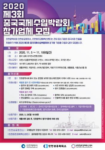 인천광역시와 인천창조경제혁신센터, 인천상공회의소는 공동으로 중국 최대 수입전시회인 제 3회 중국국제수입박람회 참가할 기업을 모집한다.