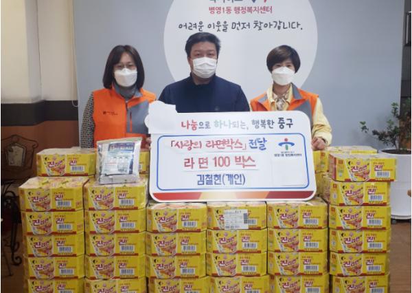 15일 병영1동 행정복지센터에 따르면 축산물 도매센터 김철현 대표는 지난 13일 오전 11시 센터를 방문해 고수옥 병영1동장에게 사랑의 라면과 마스크를 전달했다.