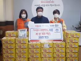 김 씨는 시가 30만원 상당의 컵라면 100박스를 자비로 구입해 이날 기증하는 한편, 직접 모은 마스크 13매도 함께 기탁했다.