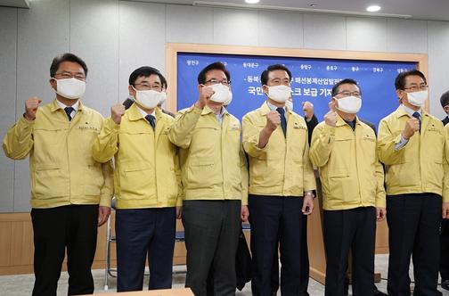 유덕열 동대문구청장이 17일(화) 오전 11시 30분 서울시청 2층 브리핑룸에서 개최된 서울시 동북권 자치구 패션봉제산업발전협의회 주최 국민안심마스크 보급 추진을 위한 기자설명회에 참석했다.