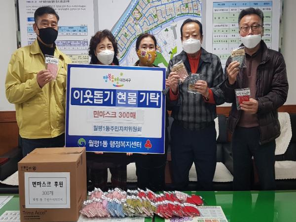 대전 서구(구청장 장종태) 월평1동 주민자치위원회(위원장 임재홍)는 지난 17일 위기가구 발굴에 앞장서고자, 후원금을 모아 300개의 면 마스크를 제작하여 월평1동 행정복지센터에 기탁하였다.