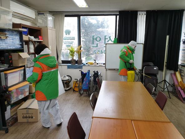 구 자원봉사센터 지역자율방재단과 주민을 사랑하는 모임 소속 자원봉사자 20여 명은 지난 17일부터 오는 27일까지 부평지역 내 다중이용시설과 단체급식소, 지역아동센터, 어린이집, 장애인시설 등 취약지역 20여 곳을 선정해 방역활동을 진행하고 있다.