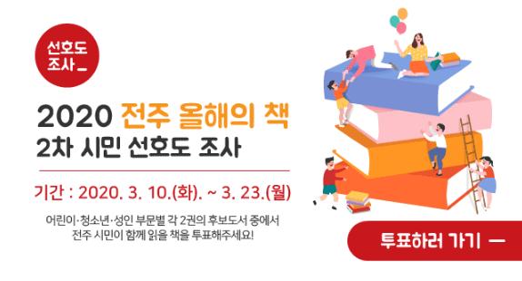 시는 오는 23일 마감 예정인 ‘2020 전주 올해의 책’ 선정을 위한 2차 시민 선호도조사에 18일 현재 2296명이 참여했다고 밝혔다. 이는 시민들에게 함께 읽는 기쁨과 독서 문화를 확산하기 위한 것으로 어린이 부문의 경우 894명, 청소년 부문 842명, 성인 부문 560명 등이 투표에 참여했다.