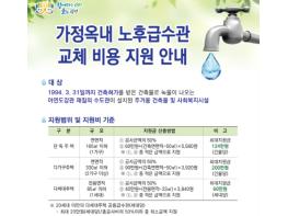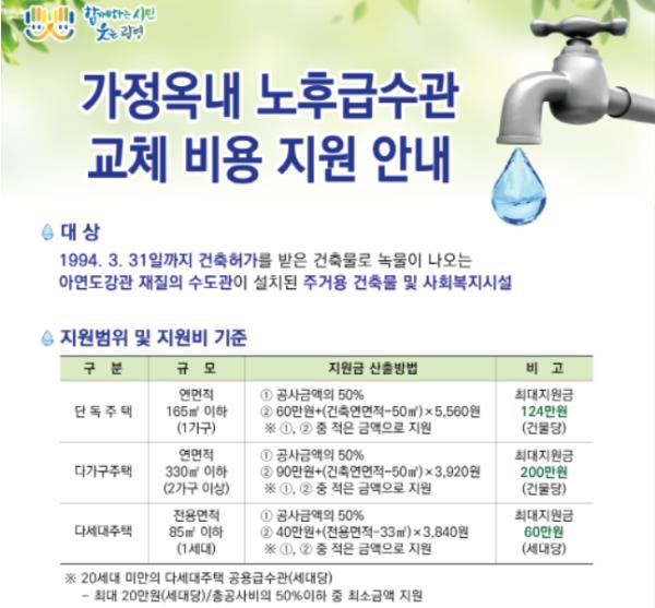 지원대상은 1994년 3월 31일까지 건축허가를 받은 건축물로 녹물이 나오는 아연도강관 재질의 수도관이 설치된 주거용 건축물 및 사회복지시설이다.