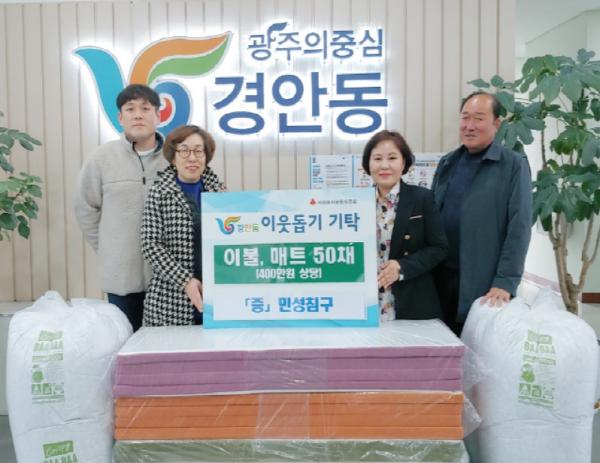 광주시 쌍령동에 위치한 민성침구 김인숙 대표는 지난 17일 경안동행정복지센터를 방문, 매트와 이불 등 침구류 50채(400만원 상당)를 기탁했다.