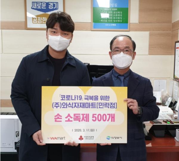 ㈜와식자재마트 민락점은 3월 17일 코로나19 확산을 방지하고 지역사회에 도움울 주기 위해 의정부시에 손 소독제 500개를 기탁했다.