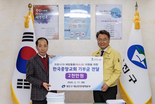 지난 17일 중곡3동에 위치한 한국중앙교회(담임목사 임석순, 광진구 기독교연합회장)는 마스크 구매를 위한 성금 2천만 원을 광진구에 기부했다.
