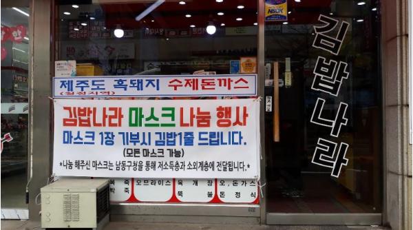 구월2동 지역 분식집인 김밥나라(대표 김동국)에서는 가게를 찾는 손님들을 대상으로 마스크를 기부하면 김밥을 무료로 제공하는 기부행사를 펼쳤고, 지난주부터 시작해 지난 17일까지 100여장의 마스크를 모았다.