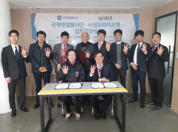 이날 상호협약식의 축하인사로는 (주)성우라이프엔의 전무이사 이태식, 전무이사 전상일, 과장 김찬호, 국제엔젤봉사단의 단장 김성남, 명예위원 이승원, 대외협력위원장 최중환, 사무국장 김동준이 자리를 빛냈다.