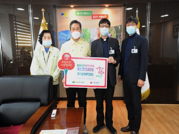 대구광역시 남구청(구청장 조재구)에서는 지난 18일, 대구가톨릭대학교병원(의료원장 송재준 신부)에서 코로나19로 인한 지역의 위기 극복을 위해 마스크 12,000장을 전달하였다고 밝혔다.