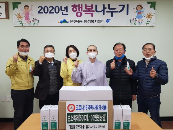부산 남구 문현4동 능가사(주지 과진스님)는 지난 11일 문현4동 행정복지센터에 코로나19 극복을 기원하며 휴대용 손소독제 500개(100만원 상당)를 전달했다.
