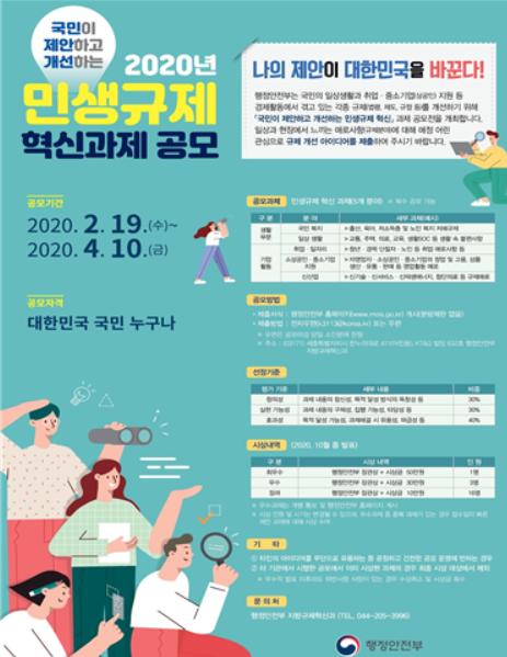 안성시는 행정안전부와 함께 개최 중에 있는 ‘국민이 제안하고 개선하는 2020년 민생규제 혁신 공모전’을 보다 많은 규제애로를 청취하고자 기간을 연장한다.