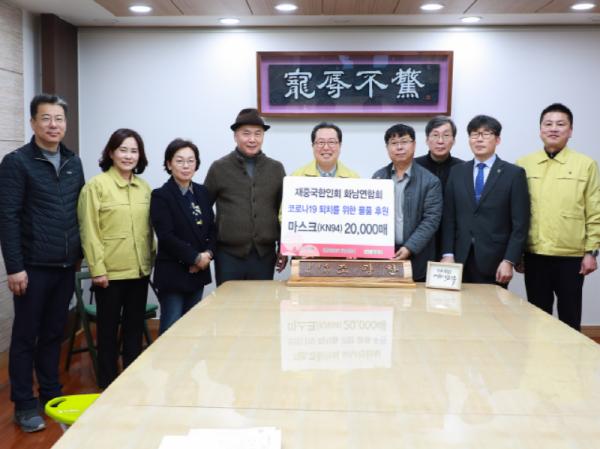 중국 화남지역에 거주 중인 재외국민들의 상공회 연합회인 재중국한인회 화남연합회(명예회장 손종수)는 19일 시장집무실에서 코로나19 극복을 위한 마스크 20,000매를 경기 사회복지공동모금회에 전달했다.