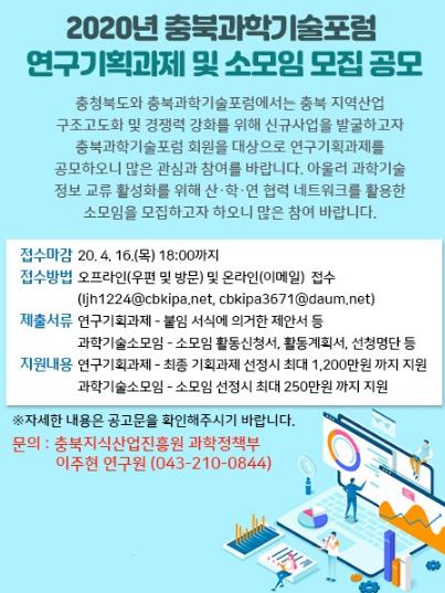 도와 충북과학기술포럼은 지역 산업 구조 고도화와 경쟁력 강화를 위해 충북과학기술포럼 회원을 대상으로 연구기획과제와 공모와 과학기술 소모임 모집을 진행한다.