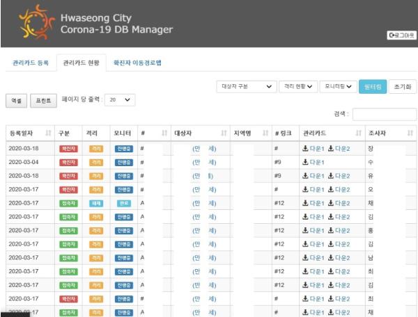 코로나19 관리카드 데이터베이스는 대상자별 관리카드와 확진자 이동경로 맵이 함께 지원되며, 확진자, 접촉자, 능동감시자, 해제자 등 대상자의 상태 변화가 실시간으로 업데이트된다.