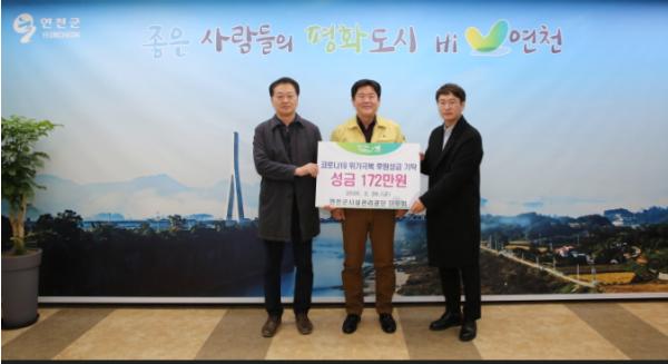 20일 연천군 시설관리공단(이사장 김응연) 단우회(회장 김준영)에서는 코로나19 위기 극복을 위한 특별성금을 모금하여 관내 어려운 이웃을 위해 써달라며 성금 172만원을 연천군에 기탁했다.