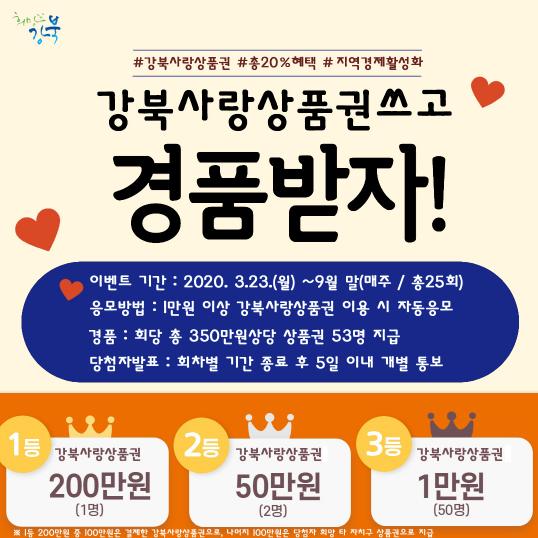 1건당 만원 이상 상품권을 사용한 소비자를 대상으로 추첨을 통해 9월까지 매주 경품 이벤트도 진행된다. 대상자는 별도의 응모절차 없이 자동 응모되며 무작위 추첨을 통해 당첨자를 선정한다. 당첨자는 각 주별로 선정해 개별적으로 통보되며 50여명에게 총 350만원 상당의 강북사랑상품권이 지급될 예정이다.