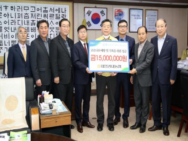 군에 따르면, NH농협은행 태안군지부(지부장 김선호) 및 관내 6개 지역농협은 지난 20일 군수 집무실에서 가세로 군수, 농협 관계자 등이 모인 가운데 기탁식을 갖고 취약계층을 위한 방역에 써달라며 1500만 원을 전달했다.