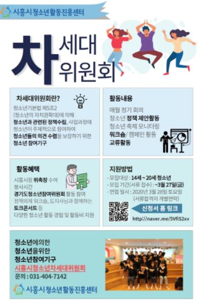 시흥시청소년활동진흥센터(센터장 김광석)는 2020년 시흥시 청소년 차세대위원회 위원 10명을 3월 27일까지 모집한다.