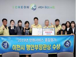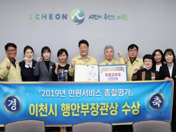 이천시(시장 엄태준)는 23일 민원처리 만족도를 높인 우수직원 6명에 대한 시상을 진행했다. 이날 행정안전부와 국민권익위원회 공동주관 민원서비스 종합평가에서 최우수기관 표창을 수상함에 따라 봉납도 함께 진행했다.