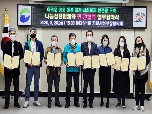 부산 서구 동대신1동 지역사회보장협의체(위원장 손외권)는 지난 20일 어려운 이웃의 돌봄체계 및 사회복지 안전망 구축을 위한 나눔실천 업체와 민·관협력 업무협약을 체결했다.