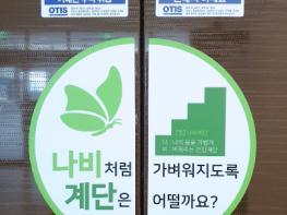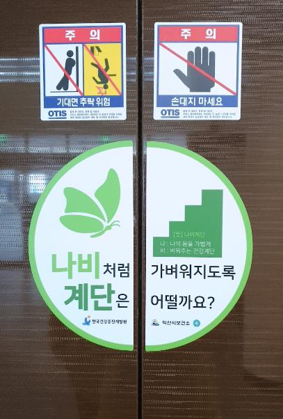 이번에 부착하는 나비계단 스티커는 나: 나의 몸을 가볍게 비: 비워주는 건강계단이라는 의미를 담고 있으며, 엘리베이터를 이용하여 4개 아파트 주민들에게 홍보할 예정이다.