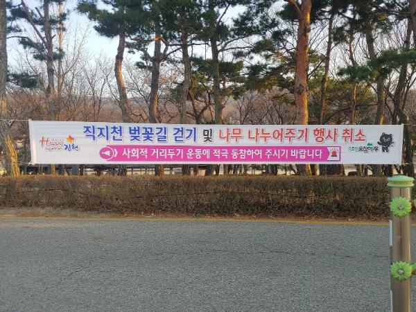 김천시는 코로나19 확산 방지를 위해 지난 21일 정세균 국무총리의 ‘사회적 거리두기 강화’를 위한 대국민 담화시 “훨씬 더 강력한 사회적 거리두기가 필요하다.”는 정부 정책에 따라 직지천 벚꽃길 걷기 및 나무 나누어주기 행사를 모두 취소하기로 결정했다.