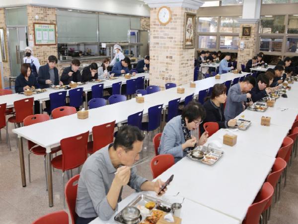 구내식당을 이용할 수 있는 좌석 수가 절반으로 줄어들기 때문에 한 번에 많은 인원이 몰리는 것을 방지하기 위해 점심시간 2부제도 시행한다.