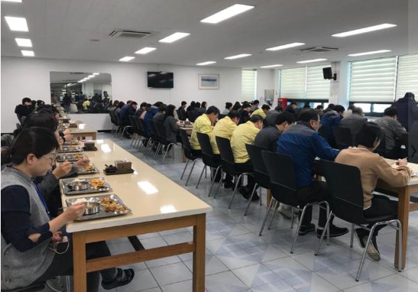우선, 본청 구내식당 이용 시간대를 4단계로 구분하고 부서별 식사시간을 지정해 운영하고 있으며, 한줄로 앉아 식사하기, 식사 중 대화금지 등을 통해 사람 간 접촉을 최소화하고 있다.