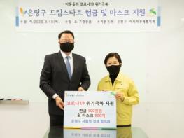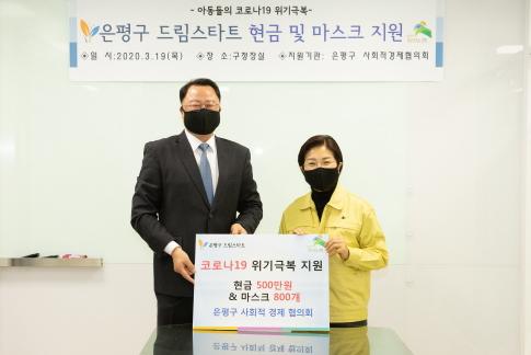 은평구 사회적경제협의회(김은복대표)는 코로나19 발생에 따라 어려운 저소득층 아동들의 건강을 위해 지난 3월 19일 은평구(구청장 김미경) 드림스타트에 후원금 500만원과 마스크 800개를 후원하였다.