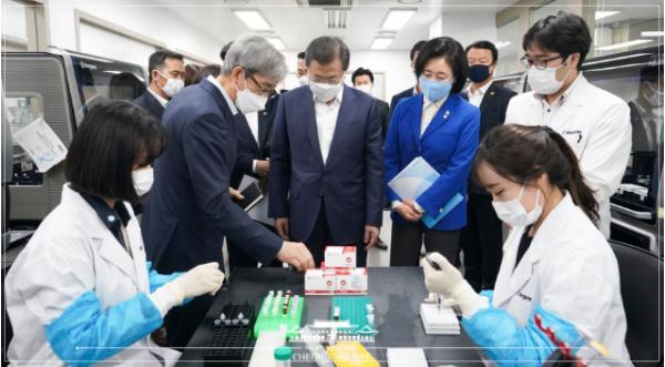 문재인 대통령은 연구시설을 둘러보며 기업의 진단시약 생산·개발 공정에 대한 설명을 들었다. 대통령은 "원래 하루 정도 걸리던 검사시간을 6시간으로 단축했고, 지금은 더 단축됐다고 알려졌다"며 지금은 어디까지 단축됐다고 말할 수 있는지 물었다. 이에 천종윤 씨젠 대표는 "1만 명을 동시에 (검사)하는데 6시간에 할 수 있다"고 답했다. 그러면서 "4월 중순이면 어떤 변이도 대응하는 것이 나올 것"이라고 설명했다.