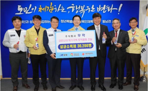 최재호 무학 회장은 “코로나19 확산으로 어려움을 겪고 있는 지역사회에 힘을 보태기 위해 살균소독제를 기탁했다. 어려울 때 필요 곳에 잘 쓰이길 바란다.”고 말했다.