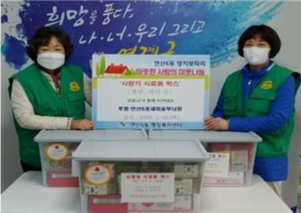 연제구 연산6동(동장 박성희)은 새마을부녀회(회장 김순희) 주관으로 지난 26일 코로나19로 인한 돌봄 취약가구 3세대를 방문해 사랑의 식료품 박스(햇반, 라면 등 16만 원 상당)를 전달했다.