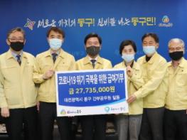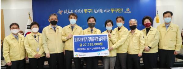 대전 동구(구청장 황인호)가 코로나19 사태로 인한 구민들의 고통을 나누고 지역경제에 활력을 주고자 급여의 일정액을 기부하는 ‘아름다운 급여기부’ 릴레이 확산에 앞장서고 있다.