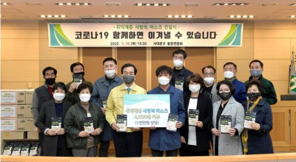 서대문구(구청장 문석진)는 서대문구 통장연합회(회장 강재용)가 최근 취약계층 이웃들에게 KF94 마스크 4천 매를 기부해 주위를 훈훈하게 했다고 27일 밝혔다