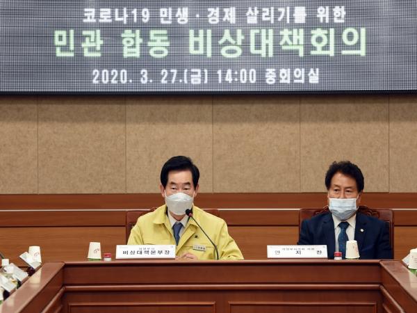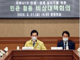 의정부시(시장 안병용)는 3월 27일 코로나19 경제 위기 극복을 위한 민관 합동 비상대책회의를 개최했다. 이날 회의는 주재자인 안병용 시장을 비롯해 안지찬 시의회 의장, 시 행정혁신위원회, 경기북부상공회의소, NH농협 의정부시지부, 경기신용보증재단, 용현산업단지, 전통시장 및 상점가, 한국외식업중앙회, 공인중개사협회 대표가 참여한 가운데 진행되었다.