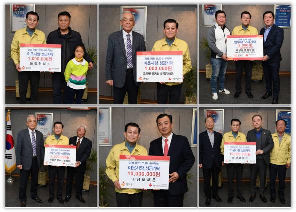원광건설(대표 최병환)에서 1,000만 원, 동림건설(대표 김용철) 100만 원, 삼보해운(대표 신희백) 1,000만 원, 교동면 안동권씨종중 100만 원, 강화군원로자문회의 100만 원을 기탁했다. 또한, 새생활 종합철강(대표 박영원, 박영덕, 박영옥)은 1,600만 원 상당의 코로나19 예방 탈부탁 모자 2,000개를 기부했다.