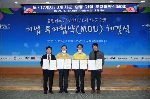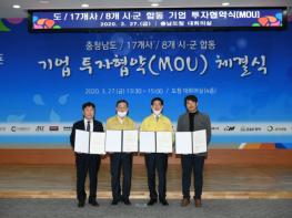 예산군은 27일 충남도청 대회의실에서 충남도와 8개 시·군, 12개 기업이 참여한 가운데 관내 산업단지에 투자를 결정한 2개 기업과 합동 투자협약(MOU)을 체결했다고 밝혔다.