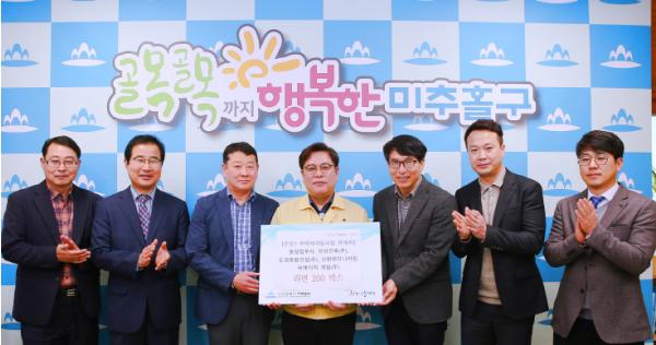 구청장실에서 열린 전달식에는 주안1구역 주택재개발 사업관계 업체인 동양법무사, 씨에이치개발(주), 신화엔지니어링, 도경종합건설(주), 인선건축(주)과 주안1구역 조합장이 참석했다.