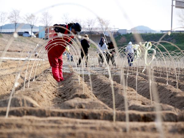 지금 농촌에는 코로나19 영향에도 불구하고 봄철 농사를 준비가 한창이다. 25일 오후 경남 의령군 화정면 화양들 마밭에는 자로 잰 듯 일궈 놓은 이랑에 대나무 지줏대 설치 작업에 여념이 없다.