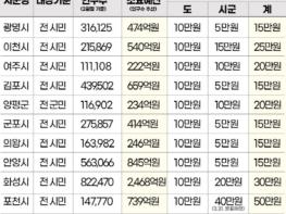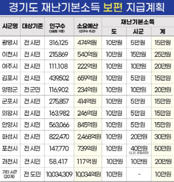 이 가운데 광명과 이천, 여주, 김포, 양평, 군포, 의왕, 안양, 화성, 포천, 과천 등 11개 시·군은 5만원에서 최대 40만원까지 모든 시·군민에게 재난기본소득을 지급할 예정이다.