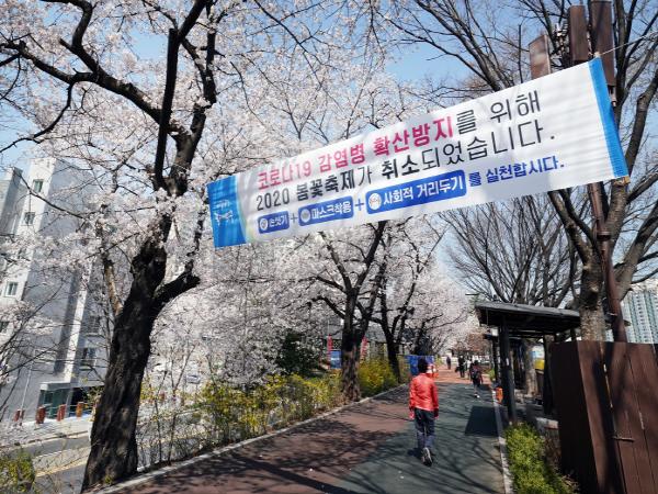 이에 동대문구는 장안벚꽃안길 주요 지점에 ‘2020 동대문 봄꽃축제’ 취소를 안내하는 현수막을 게시했다. 더불어 장안벚꽃안길에 있는 운동기구에 이용 차단을 위한 테이핑을 하고 안내문도 붙여 주민들이 이용할 수 없도록 했다.