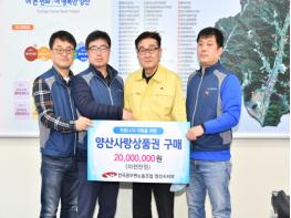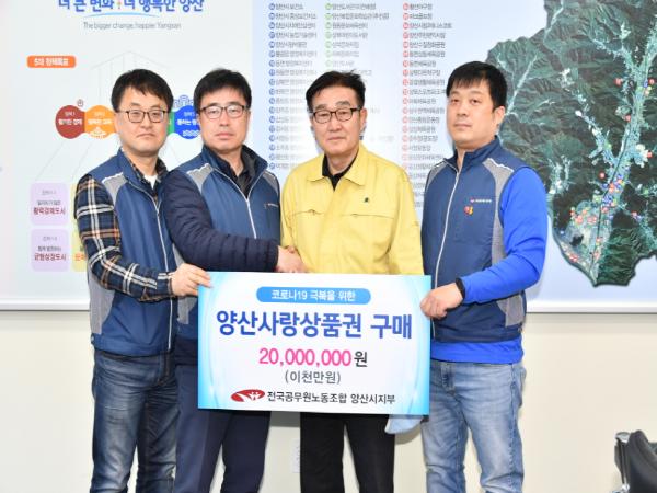 양산시 공무원노조(지부장 김재광)는 코로나19로 인한 지역경제 침체를 소비촉진을 통해 극복하고자 2,000만원 상당의 양산사랑상품권을 구매하기로 했다.